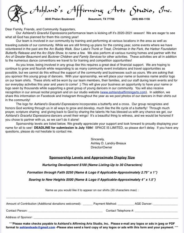 "Our Ashlandโs Graceful Expressions performance team is seeking sponsors for this coming year. While times are very uncertain, we plan to keep this group dancing as much as possible, giving them every opportunity to train and share what they love with others! The deadline is July 15th, so please let us know if you are interested in sponsoring this amazing group of young people-the return in your investment is priceless! Thank you for always loving and supporting them!