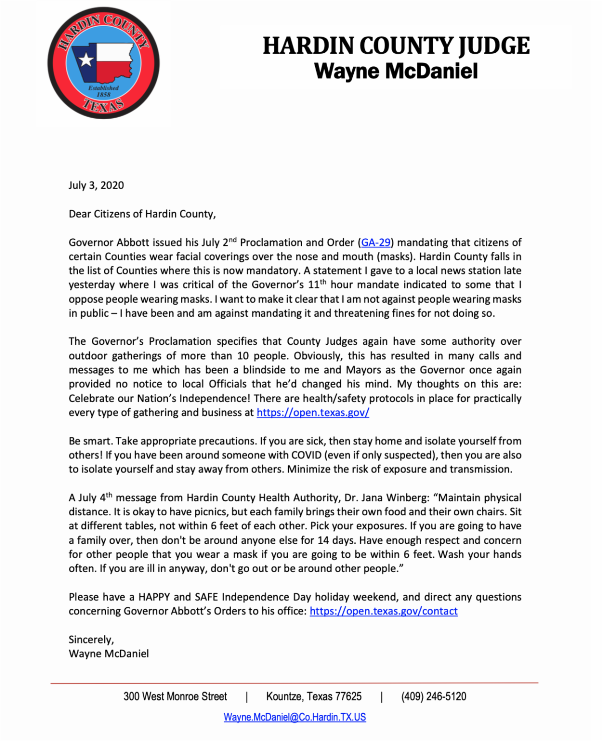 From Hardin County Judge Wayne McDaniel: Governor Abbottโs Order GA-29 Mandating the Wearing of Masks in Hardin County.