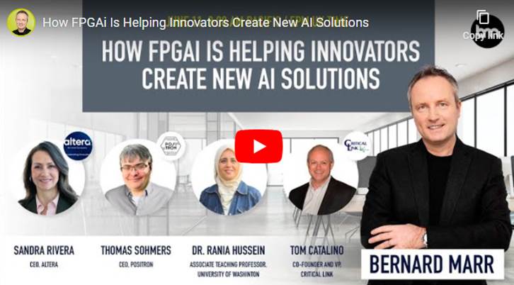 Learn more about how Altera is partnering with Dr. Rania Hussein from the University of Washington and LabsLand to accelerate the AI revolution, powered by FPGAs; in a deep dive with Business Influencer, Bernard Marr.