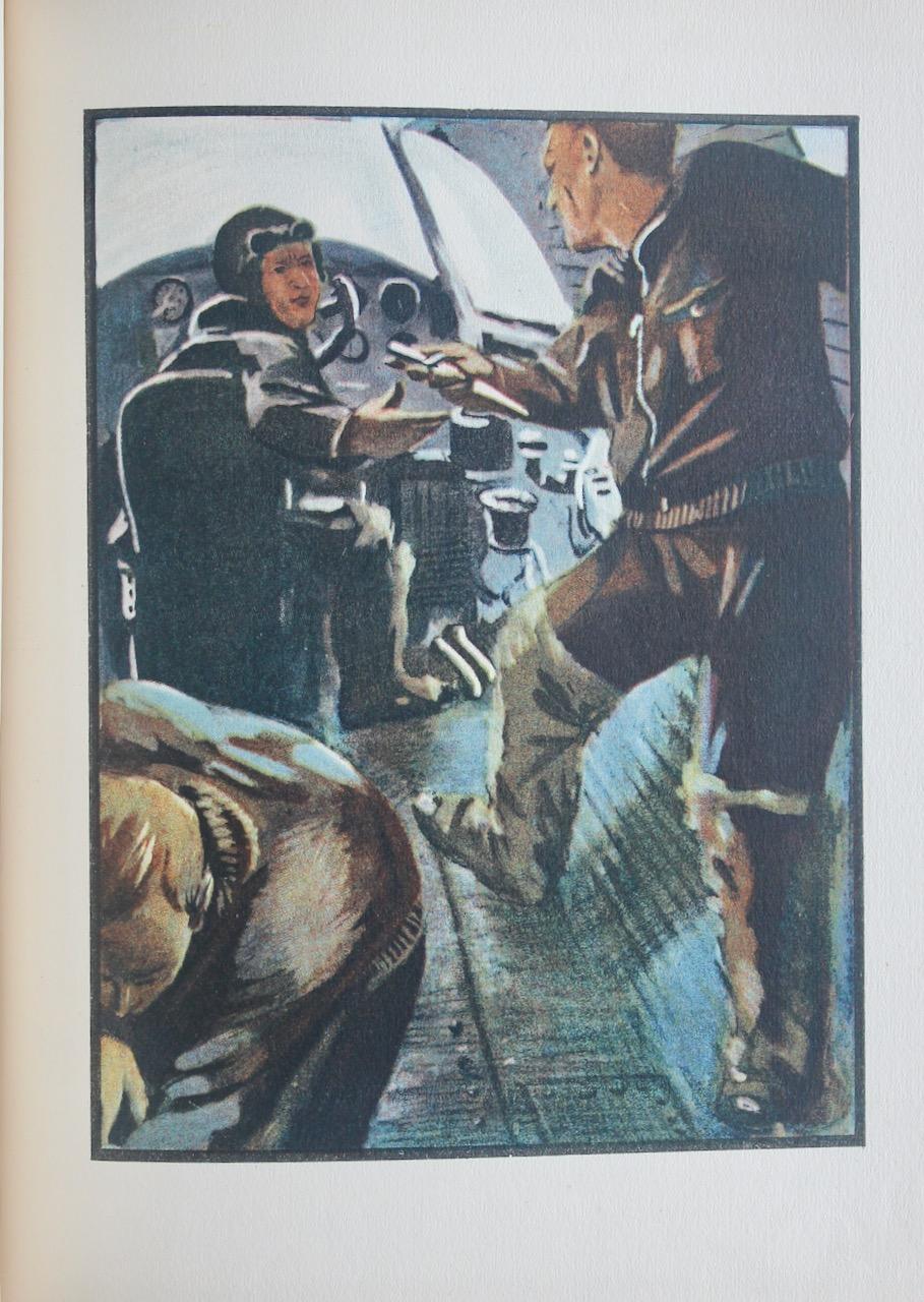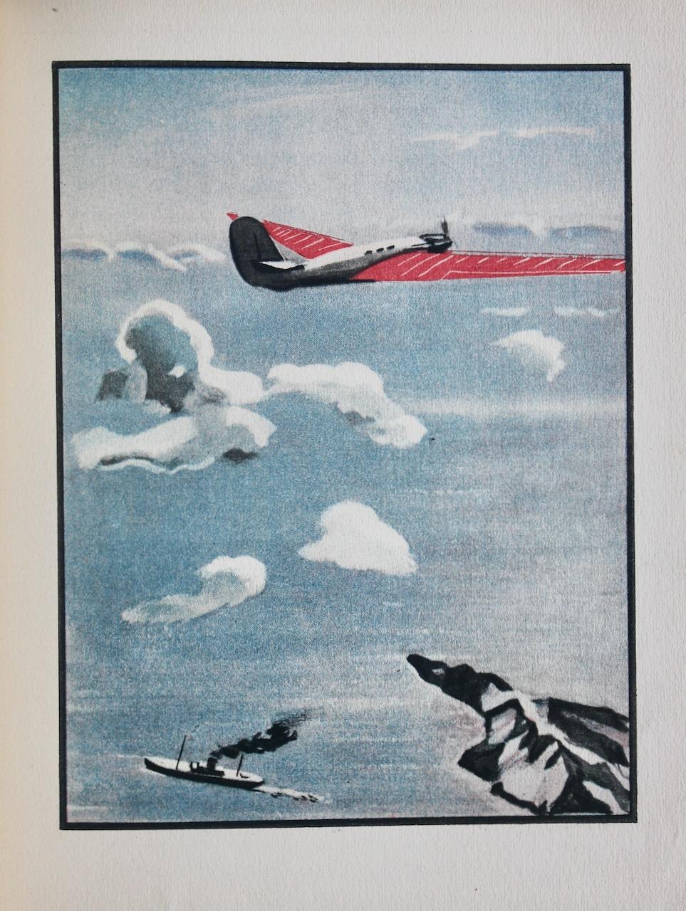 10--Baidukov, G. (text), Deineka, A. (illust.). Cherez Polyus v Ameriky ("Across the Pole to America"). 1938. Hard cover book with cloth spine detailing this celebrated 1937 flight from Moscow to Portland with 12 drawings by Deineka. G-VG copy with moderate chipping and soiling at covers. Children's Literature Publishing House. Moscow. Tirage, 200,300. 40 pp. 9 1/2 x 7 1/2". [See Karasik, M., The Shock-Work Book for Soviet Children. Udarnaia kniga Sovetskoi detvory, pp. 187, 2010.] $950.