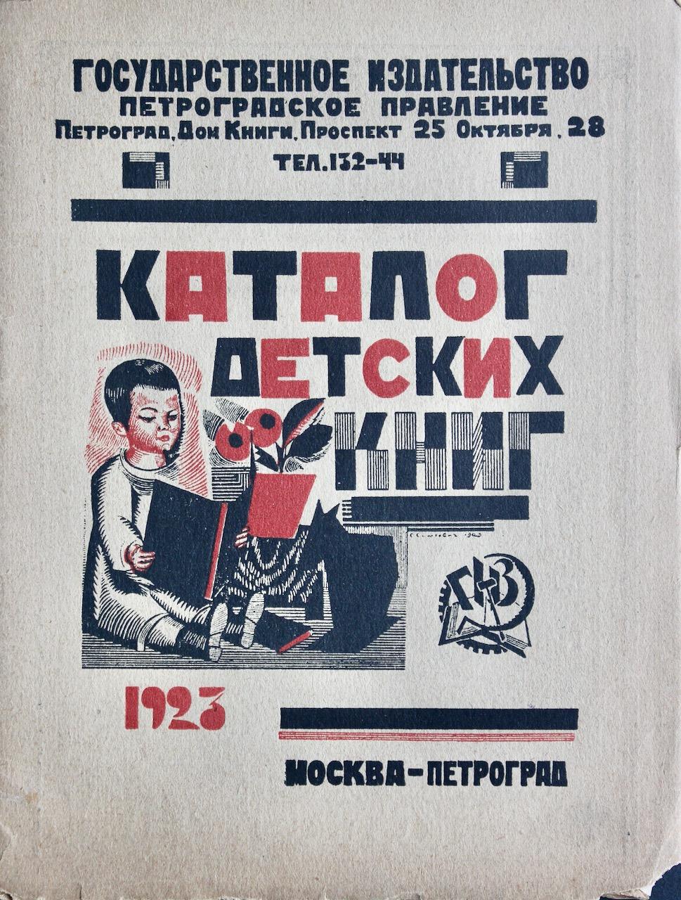 9--Katalog Detskikh Knig ("Catalog of Children's Books"). 1924. Early catalog of children's books at beginning of Soviet period. Near Fine copy with minor chipping at covers and bukinist stamp on title page. GIZ, Petrograd. Tirage, 1,000. 24 pp. 7 x 5 3/8". $1,200. | |