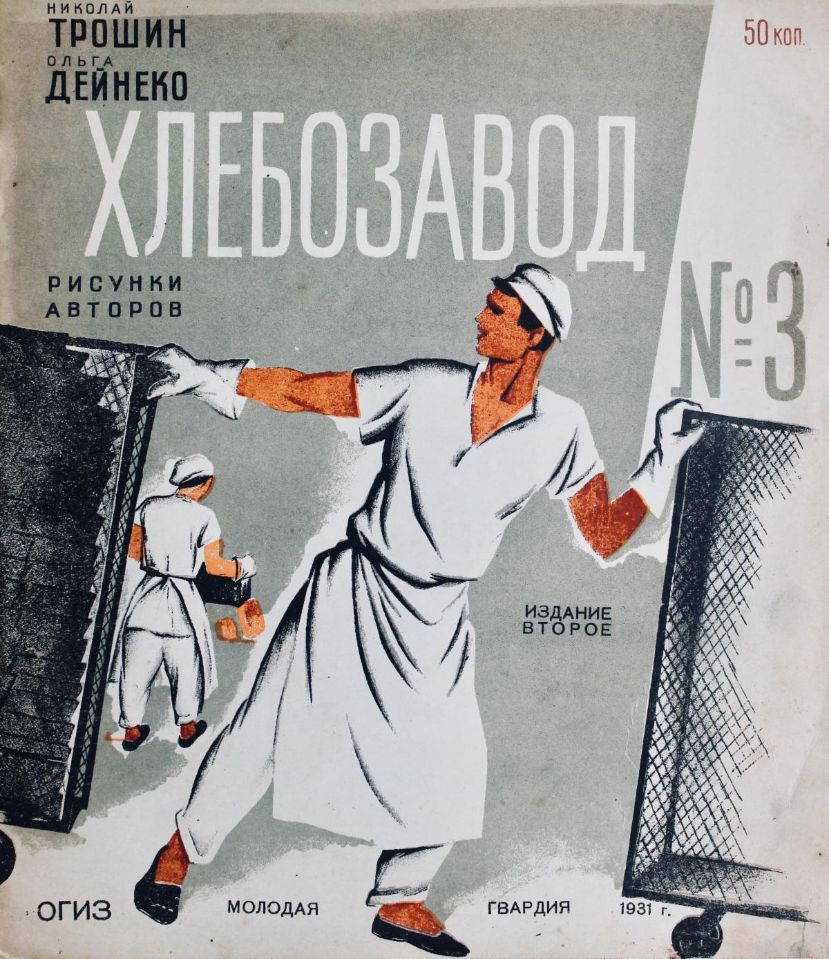 15--Troshin, N., Deineko, O., drawings and text. Klebozavod No. 3 ("Bakery No. 3"), 2d ed. 1931. Full-page illustrations, including fold-outs, by these prolific artists. VG copy. Ogiz Molodaya Gvardiya. Moscow. Tirage, 30,000. 16 pp. 8 7/8 x 7 7/8". [See Lurye, A., A Book for Children. Kniga Dlya Deti 1889-1939, Vol. 2, pp. 224-225, 2009.] $1,200.