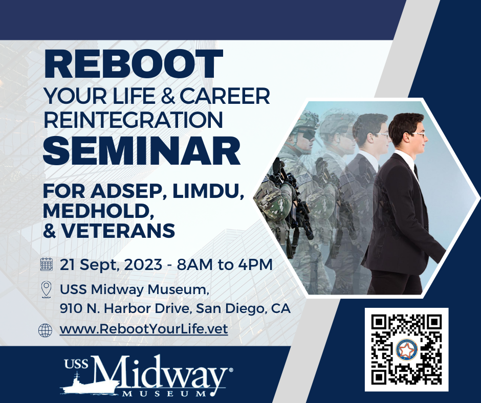 Dear Maurice, we understand that transitioning from military service can be a challenging and stressful experience. As a separating military or veteran, it is natural to feel uncertain about your next career move. That's why we would like to invite you to attend/join us on the USS Midway for a special seminar designed for individuals on LIMDU, ADSEP, and/or MEDHOLD. Past attendees have reported exceptional results from this seminar, which aims to reduce stress, help you find your next mission, and connect you with community resources to successfully prepare for your next mission in life. |