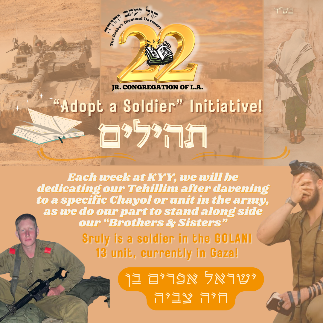 KYY took on the Hachlota to add in our Tehillim in honor of our Brothers and Sisters in Eretz Yisorel. Each week after davening, instead of rushing to the kiddush, we join together in Tehillim for the safety of Eretz Yisroel.