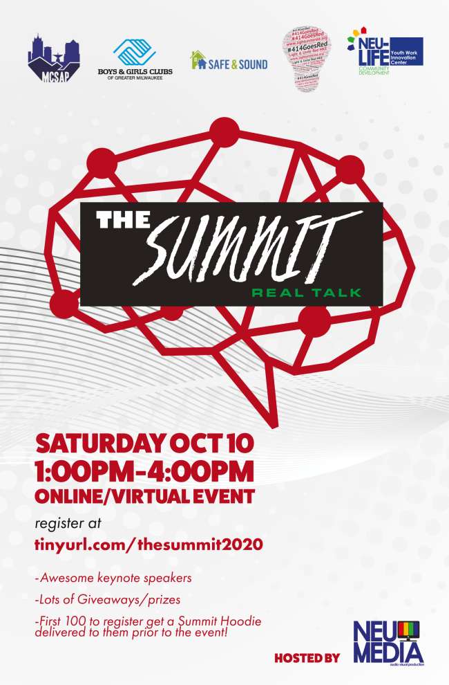 Vision 2020 Youth Summit: We’re pleased to announce our 2020 youth summit, with the theme of "Vision 2020." Participants will focus on their talents, hopes, and strengths while taking part in workshops; the first 100 to register will receive a free hoodie. This summit will take place online from 1 to 4 p.m. on Saturday, October 10. It's organized by MCSAP, Boys & Girls Clubs of Greater Milwaukee, Safe & Sound, Light & Unite RED, and Neu-Life Community Development. Get details and register here.
