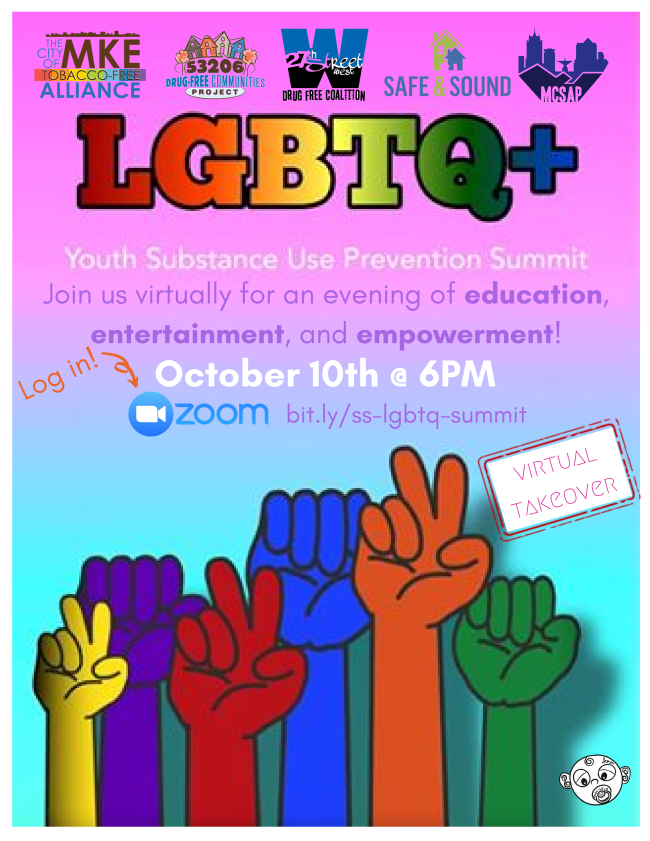 LGBTQ+ Youth Substance Abuse Prevention Summit: The 27th Street West Drug Free Coalition along with the City of Milwaukee Tobacco Free Alliance will host a Virtual LGBTQ+ Youth Substance Use Prevention Summit on October 10. The goal of this event is to uplift Milwaukee's young LGBTQ+ people and to create space for them to be heard. MCSAP, 53206 Drug-Free Communities, and Safe & Sound are additional sponsors. Log in at 6 p.m. on October 6 to bit.ly/ss-lgbtq-summit to watch on Zoom or fb.me/e/cvcFurvpe to watch on Facebook Live for an evening of education, entertainment, and empowerment.