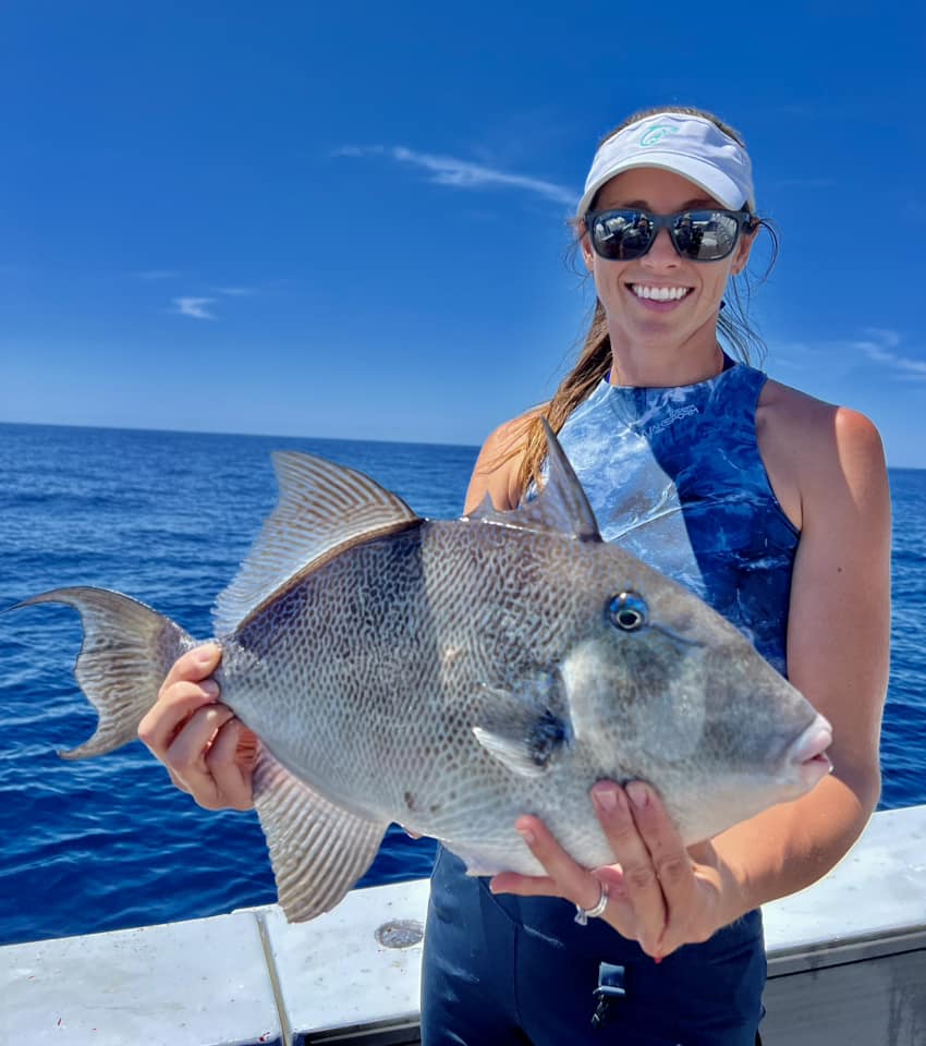 Glorianne Boyd with a grey triggerfish she caught while fishing offshore with her husband and Capt. Chase Norwood.