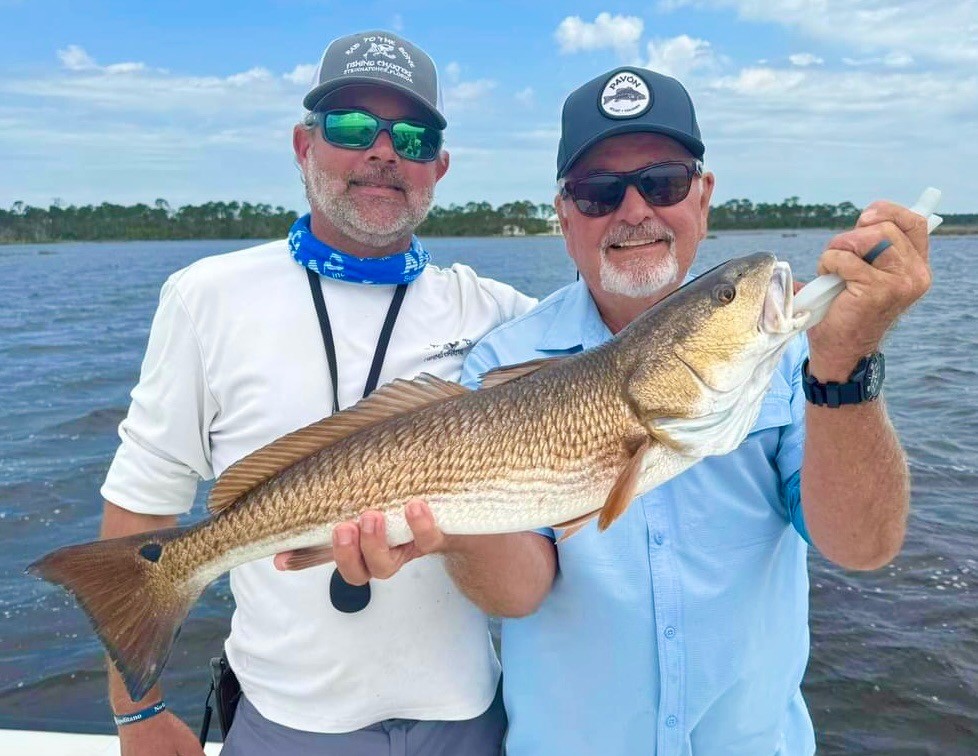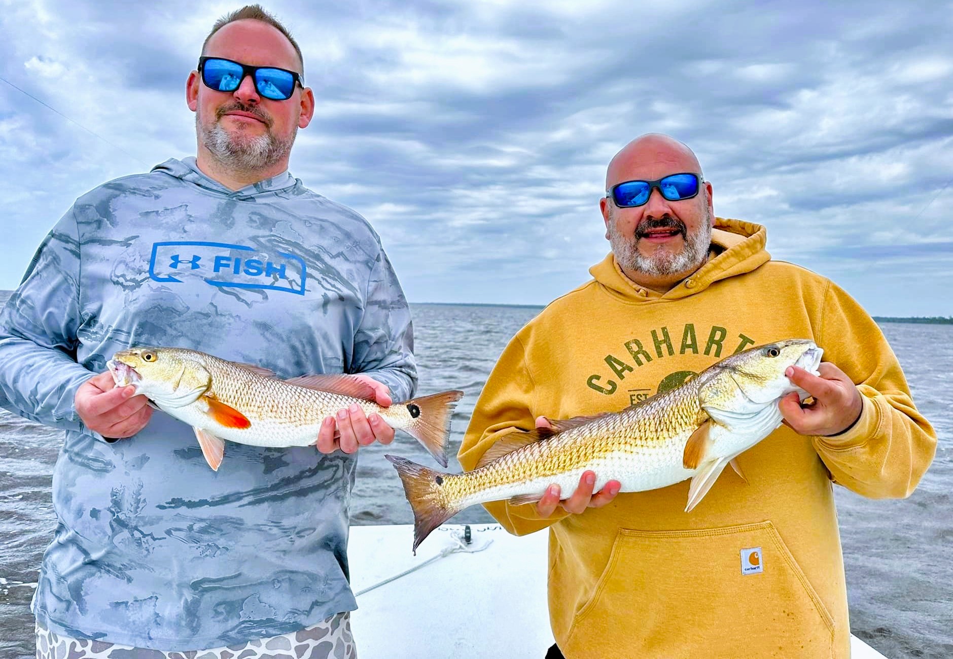 Brent and Tom with two keeper redfish they reeled in while fishing with Capt. Chase Norwood.