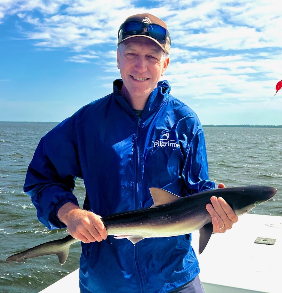 Dan with a small black nose shark he landed with Capt. Chris "Chico" Graham.