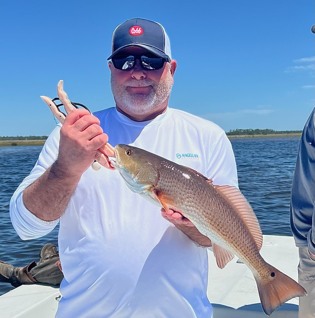 Jamie with a beautiful redfish he caught while fishing with his buddies and Capt. Chris "Chico" Graham/