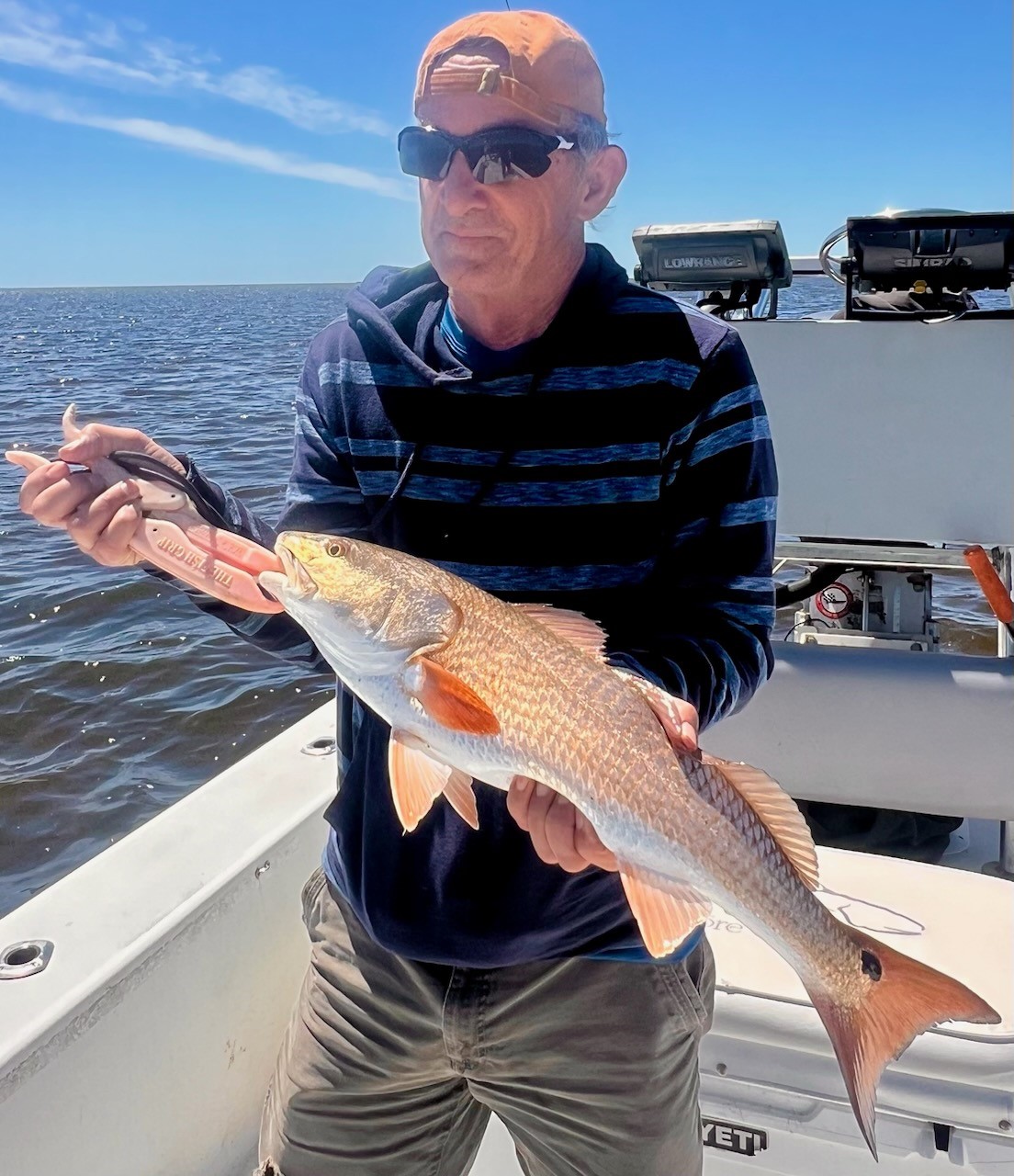 Joe holding a perfect redfish he caught while fishing with Capt. Chris "Chico" Graham.