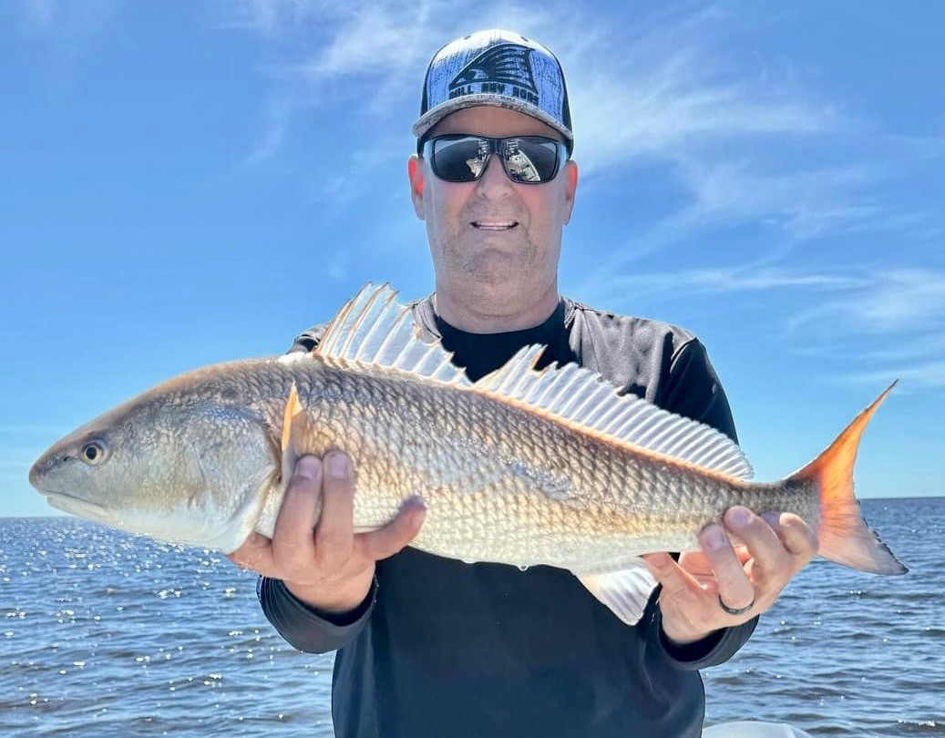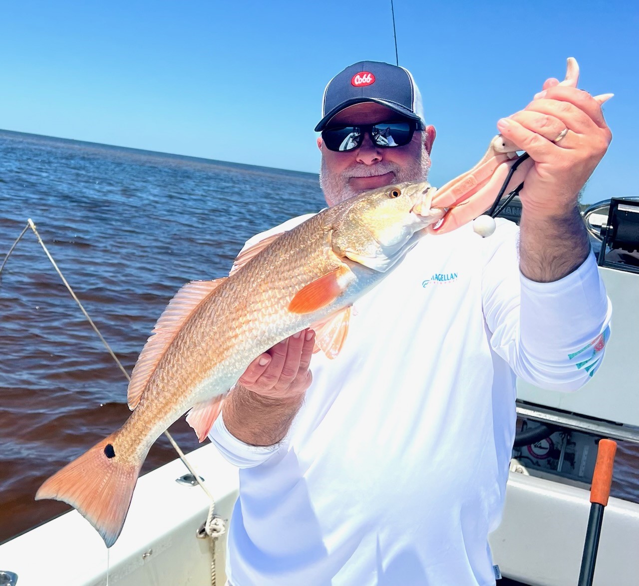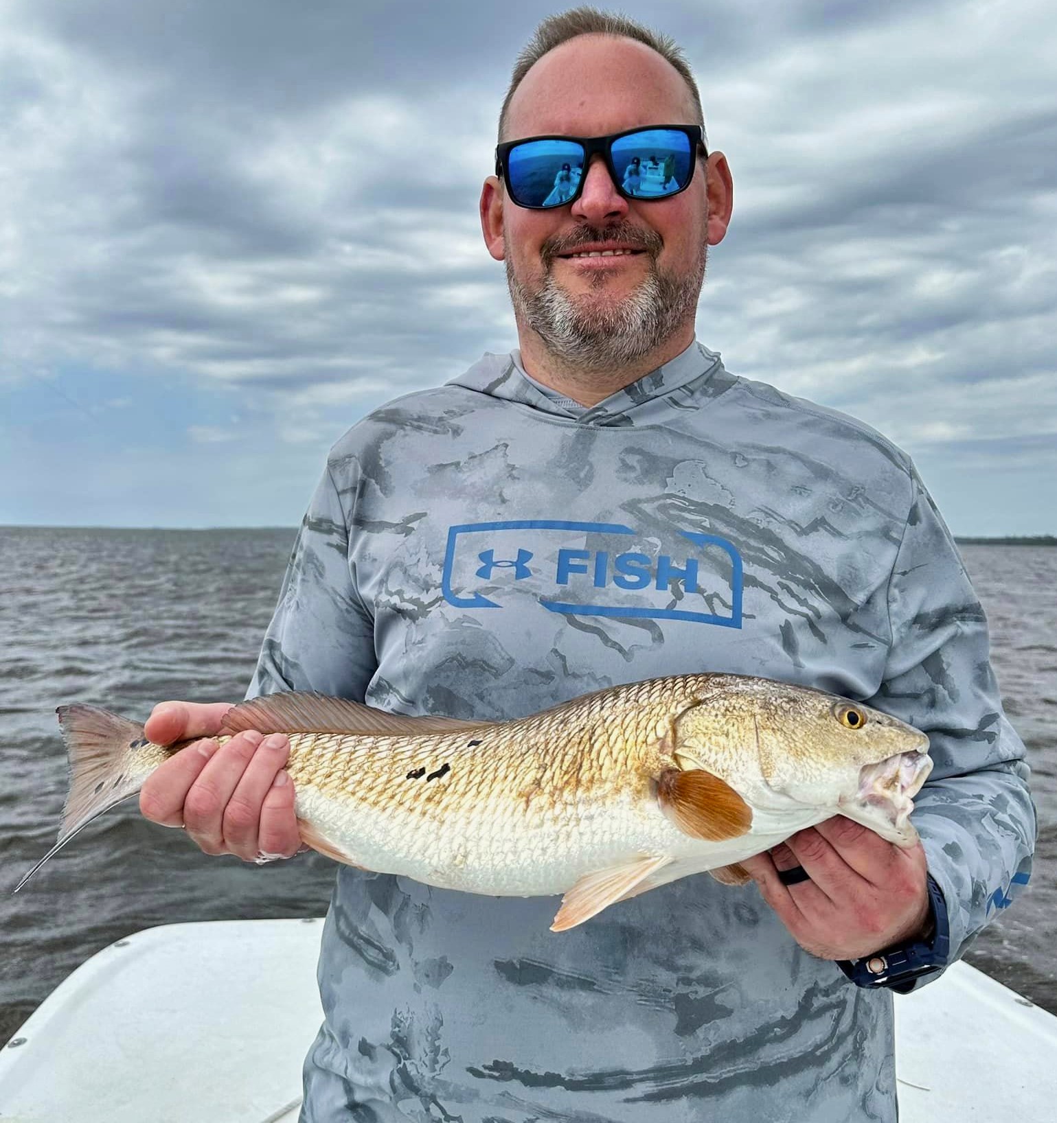 Brent with a multi-spotted redfish he reeled in during an inshore fishing trip with Capt. Chase Norwood.