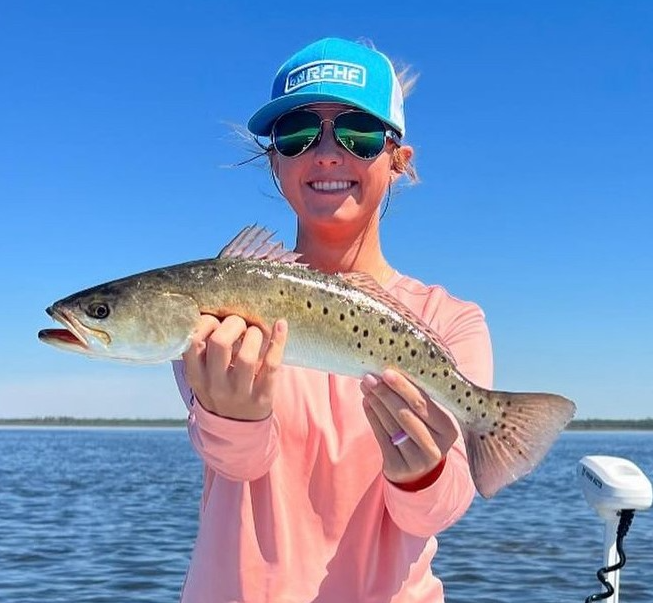 Miranda Riels with a good keeper trout she caught south of Steinhatchee.