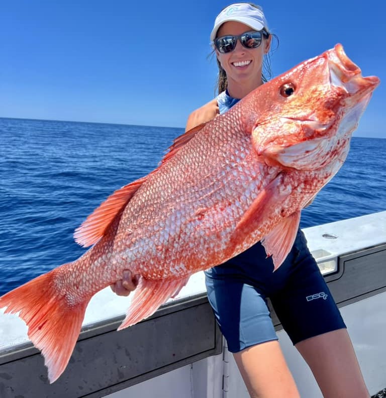Glorianne Boyd is holding up a huge red snapper she caught while offshore fishing with her husband and Capt. Chase Norwood. The season isn't here yet, so this beauty was safely released to catch another day!