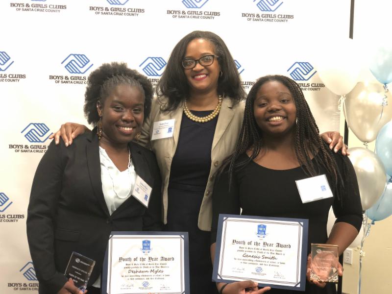 Deshaun Myles (2018 Youth of the Year Boys & Girls Clubs of Santa Cruz County), Keisha Frost (Executive Director of United Way Santa Cruz County), and Genesis Smith (2018 Youth of the Year Runner-Up) |