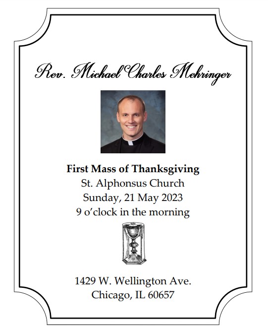 This Sunday, all the faithful of St. Alphonsus are invited to newly ordained Father Michael Mehringer's first Mass of Thanksgiving at 9 AM. Our music director Brian Bloye and team of musicians will have a glorious music program for this Thanksgiving Mass. Be sure to give Father Mehringer congrats!! There will be donuts/coffee hospitality afterwards in the narthex.