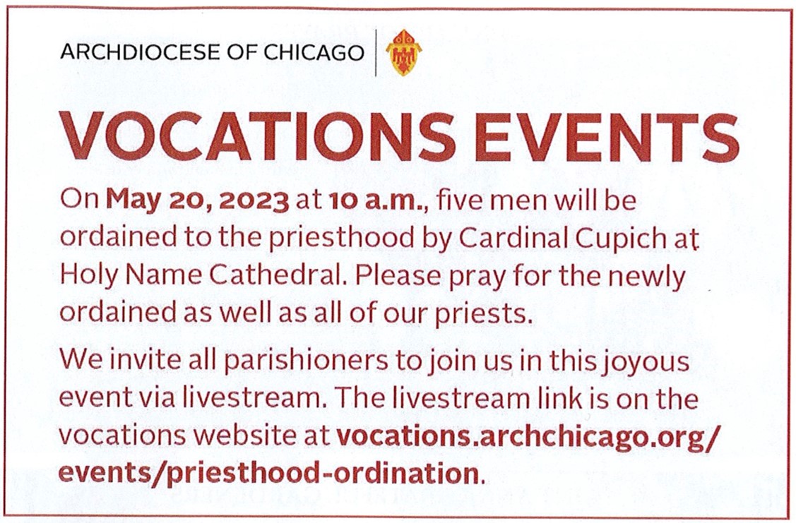 Confessions will not be heard this Saturday morning because all parish priests will be attending the Ordination Mass at Holy Name Cathedral. Saturday confessions from 11-Noon will resume next weekend, May 27, as normal. And of course, Reconciliation is available each Wednesday during Adoration from 6:30-7:30 PM.