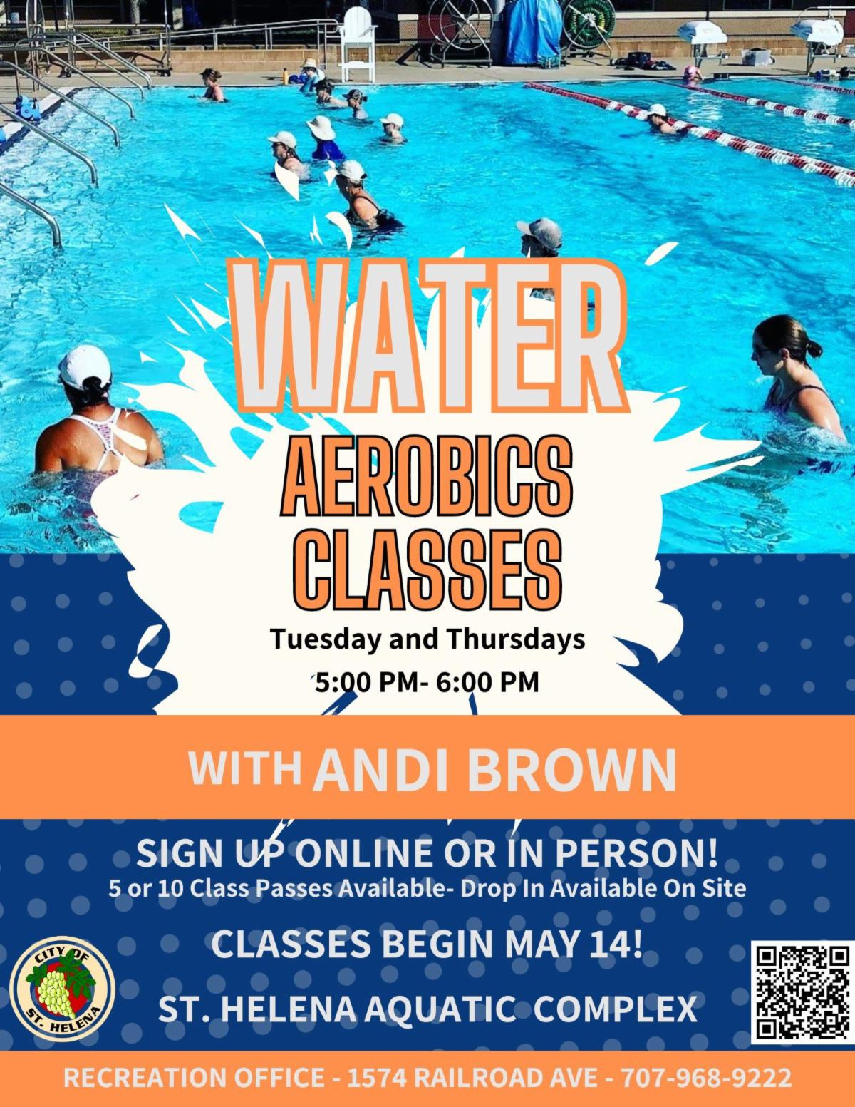 Water Aerobics with Andi Brown start this week! These classes will be held Tuesday and Thursdays from 5 p.m. to 6 p.m. at the St. Helena High School Aquatics Facility. Weights, noodles, and belts are all provided at the pool. Just bring yourself, a towel, and a water bottle! This class is available through purchase of class passes or drop-in. The punch passes are available in 5 or 10 class punch passes. 5 class pass is $50 and 10 class pass is $90. Drop-in rate is $10 per class.