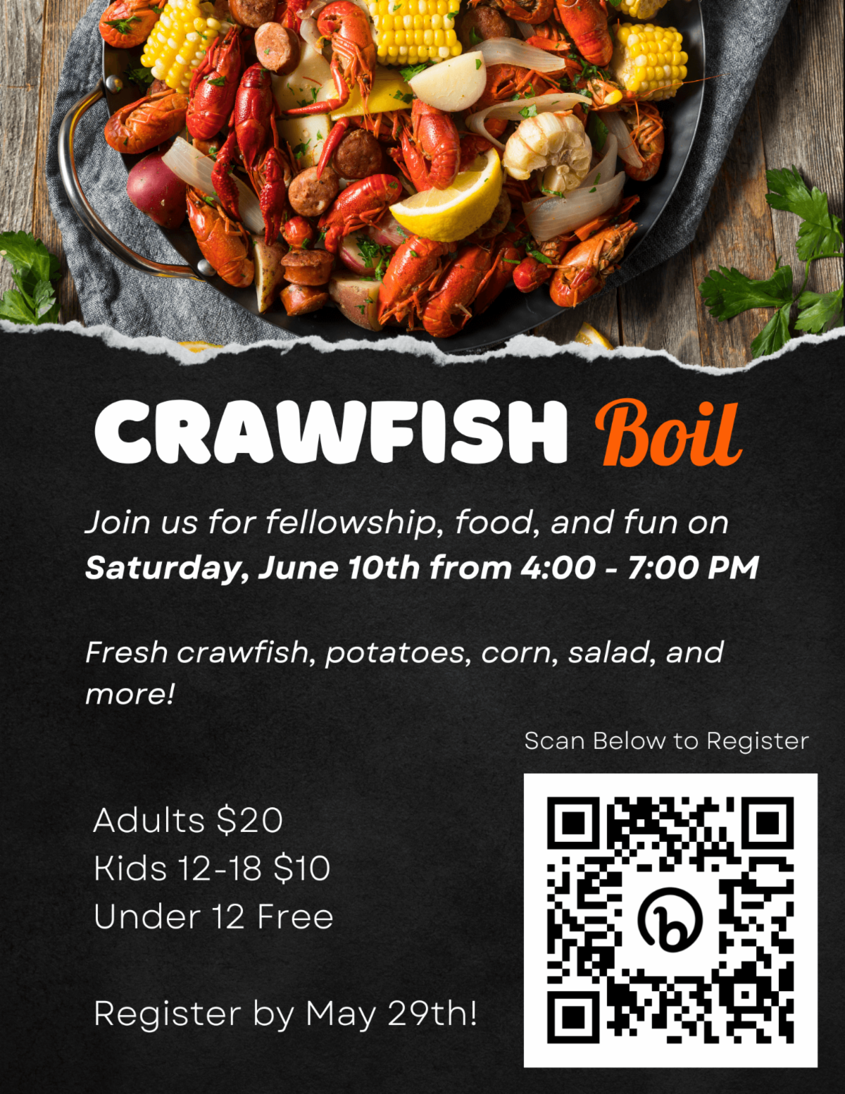 Join your parish family for a Crawfish Boil with all the fixins on Saturday, June 10 from 4-7 p.m. This is a time for church-wide fellowship with music, games and fun for the whole family! We’ll have Louisiana crawfish with potatoes and corn, salad, and the most delicious sides catered by Daddy D’s Soulfood Restaurant. Meal includes dessert (cookies & popsicles) and a drink. For more info, email Laurie Parkerson.