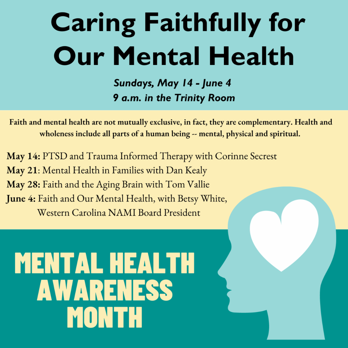 From Sunday, May 14 to June 4, St. James will be observing Mental Health Awareness Month with a new formation series called Caring Faithfully for Our Mental Health. Professionals from several areas of our community life will join us each week to discuss the importance of de-stigmatizing mental healthcare and how issues affect different age groups, from youth to older adults.