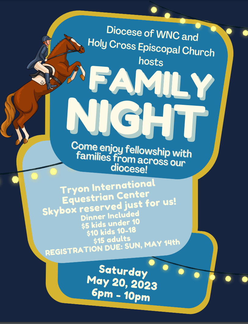 Join us for a fun filled evening for all families in the Diocese at the world famous Tryon International Equestrian Center. It will be held during their spectacular event "Saturday Night Lights". This event feature world class horse show jumping with competitors coming from around the world to participate.