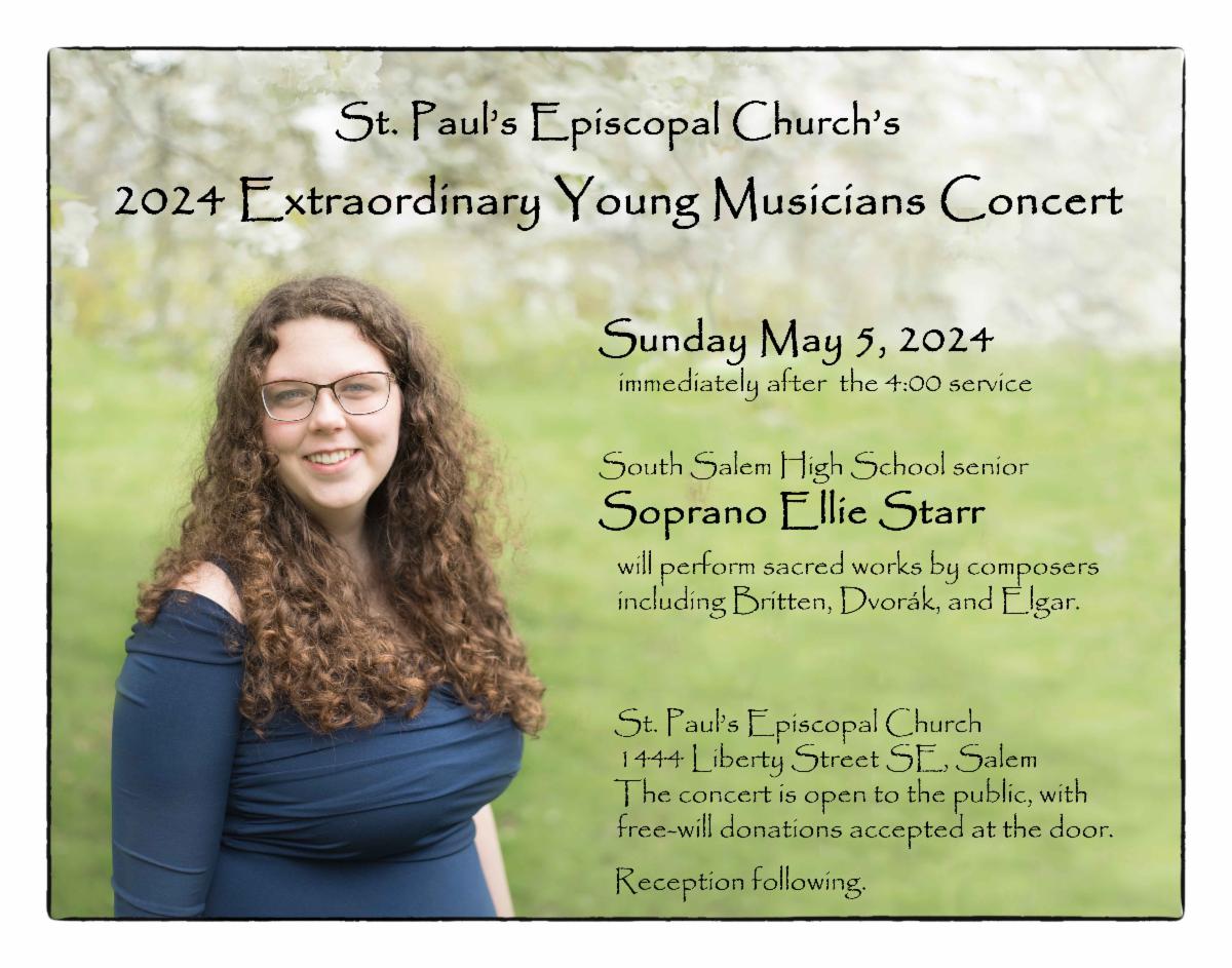The Extraordinary Young Musicians at St. Paul's concert will highlight South Salem HS senior Ellie Starr. She will offer sacred piano and vocal solos for this concert scheduled for May 5 at 4:00pm following the service of Evensong.