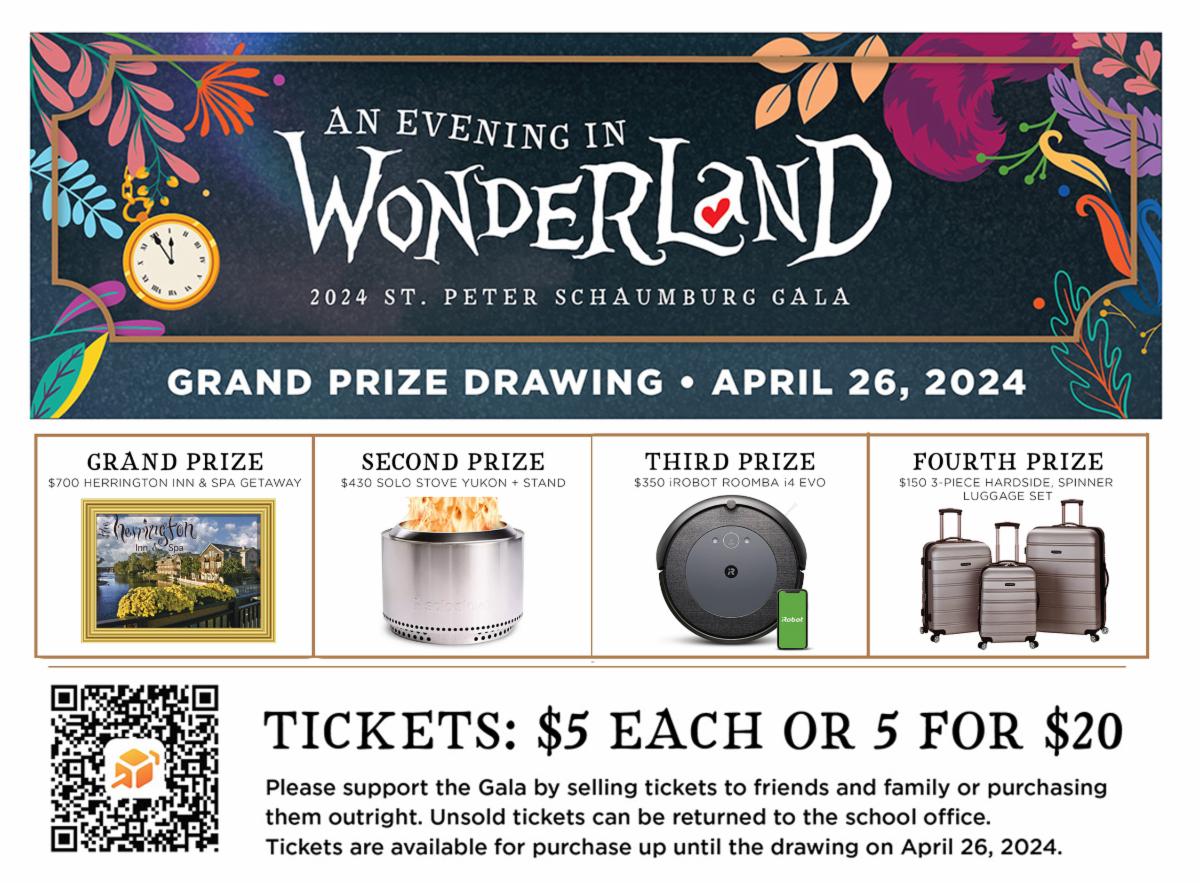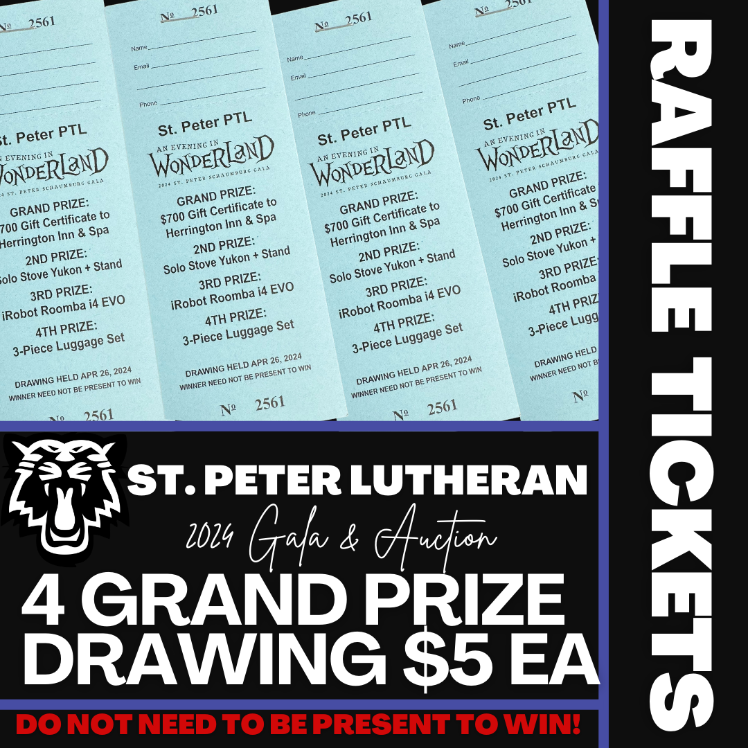 Tickets to the event are $100 per person, $180 per couple, or $900 per table of 10. This ticket includes dinner, dancing, & open bar. Doors open at 5:30pm and dinner begins at 7pm. There will be a live auction, silent auction, grand prize drawings, box drawings, and wine pull. Tickets can be paid by cash, check (payable to St. Peter PTL) or online at https://aesbid.com/ELP/SPLS24/. Tickets need to be purchased by April 8th.