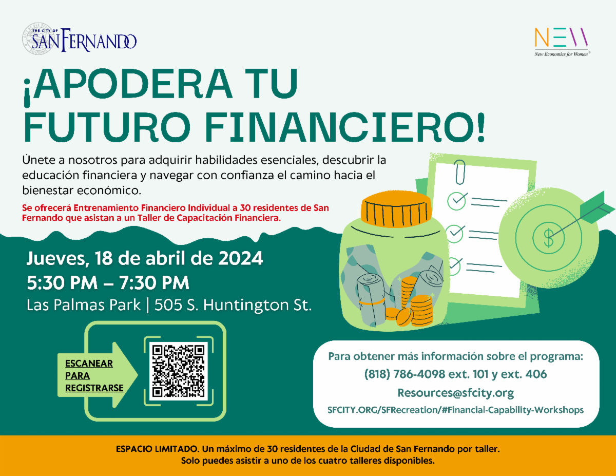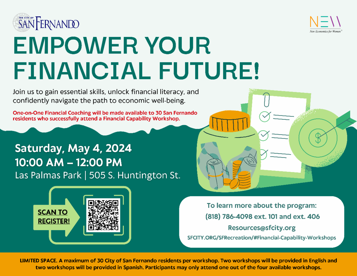 Empower your financial future! Attend this workshop to gain essential skills, unlock financial literacy, and confidently navigate the path to economic well-being. One-on-One Financial Coaching will be made available to 30 San Fernando residents who successfully attend a Financial Capability Workshop.
