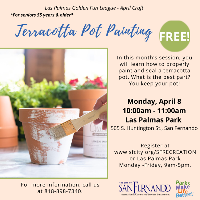 Spruce up your garden and expand your creativity by attending this free terracotta pot paining class on Monday, April 8th at 10am. Register at Las Palmas Park (818) 898-7340.