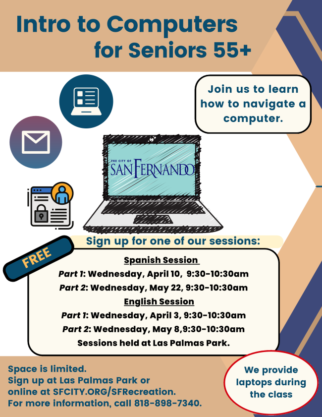 Las Palmas Park is hosting Intro to Computers for Seniors 55+. Register at Las Palmas Park to learn the basics of navigating a computer. Classes available in English and Spanish. Laptops provided during class.