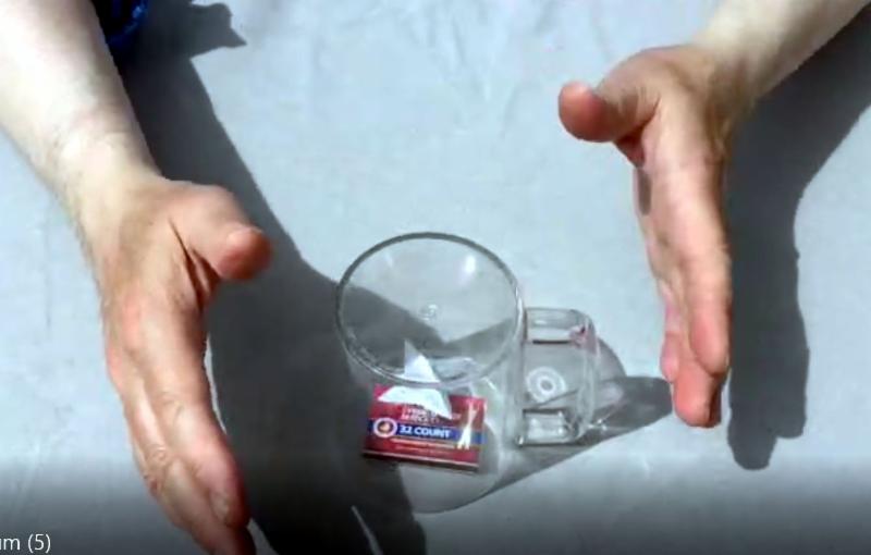 The performer now invites a spectator to blow their breath at the inverted glass to show that no breeze can penetrate the enclosed glass and reach its sealed contents. The performer then places both of his/her hands some distance apart from each other with the inverted glass at their center. After a few moments of concentration by the performer, the paper star it is seen to begin to move “rotate” ever so slightly.