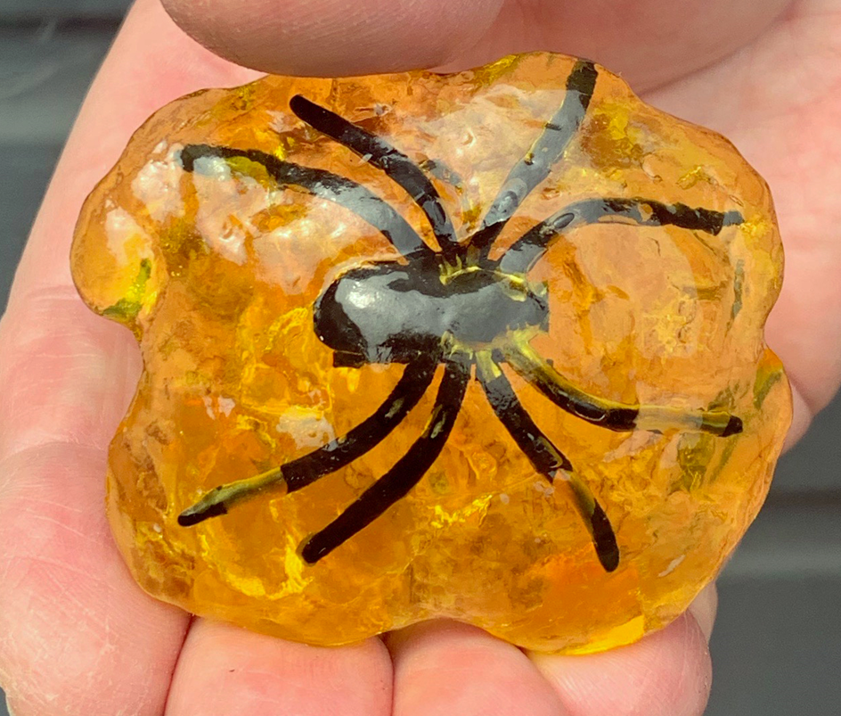 The performer upon retaking hold of the AMBER proceeds to demonstrate how the spider found its way to being entrapped within the AMBER, he does this by momentarily encircling his fingers around the AMBER, at the some time he requests one of the spectators to extend out one of their hands palm up, the performer then visibly holds the AMBER with its entombed spider just above the spectator’s out stretched palm and request all to focus on the entrapped spider, as they do this they suddenly begin to see the spider ever so slightly move within the AMBER, the movement continues when all of a sudden the spider leaps FREE onto the spectators outstretched palm, leaving the solid piece of “Fossilized Resin” AMBER now visibly empty of its once entrapped and entombed spider.