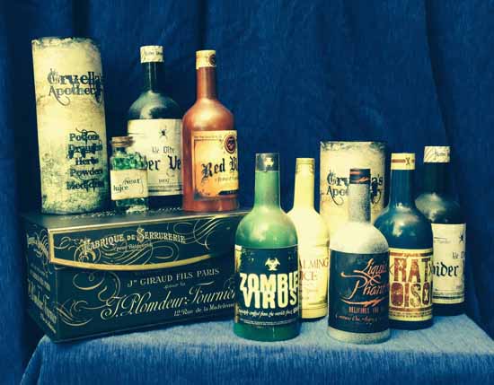 Note: From Jim Kleefeld: I recently upgraded the look on these latest edition with a much better design and paint job. Original sets were spray-painted red, blue, green, etc. These updated sets are dusky, mottled, and splotchy evoking an aged look. I also designed all new creepier art for the cover tubes. The earlier ones could of been interpreted as too “Halloween.” While this lates version can be used in bizarre settings, Mad scientist and of course Halloween themed shows.