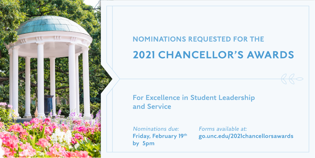 Visit the Chancellor’s Awards page for more information about each prize and contact information. Nominations are due by 5:00 pm on Friday, February 19. The awards will be presented at the Virtual Chancellor's Awards Ceremony on Tuesday, April 27.