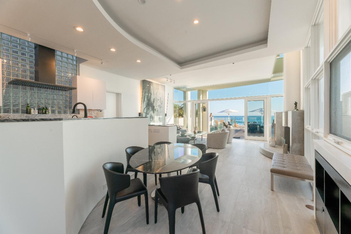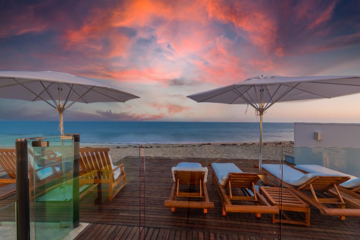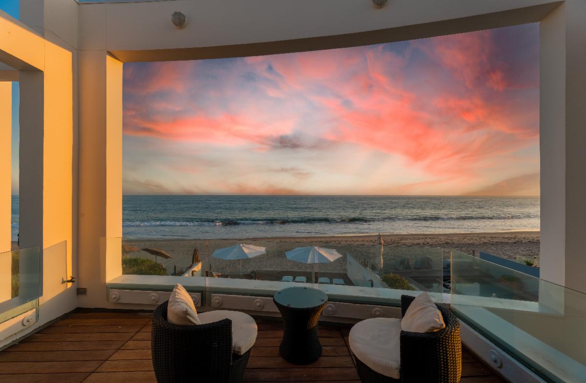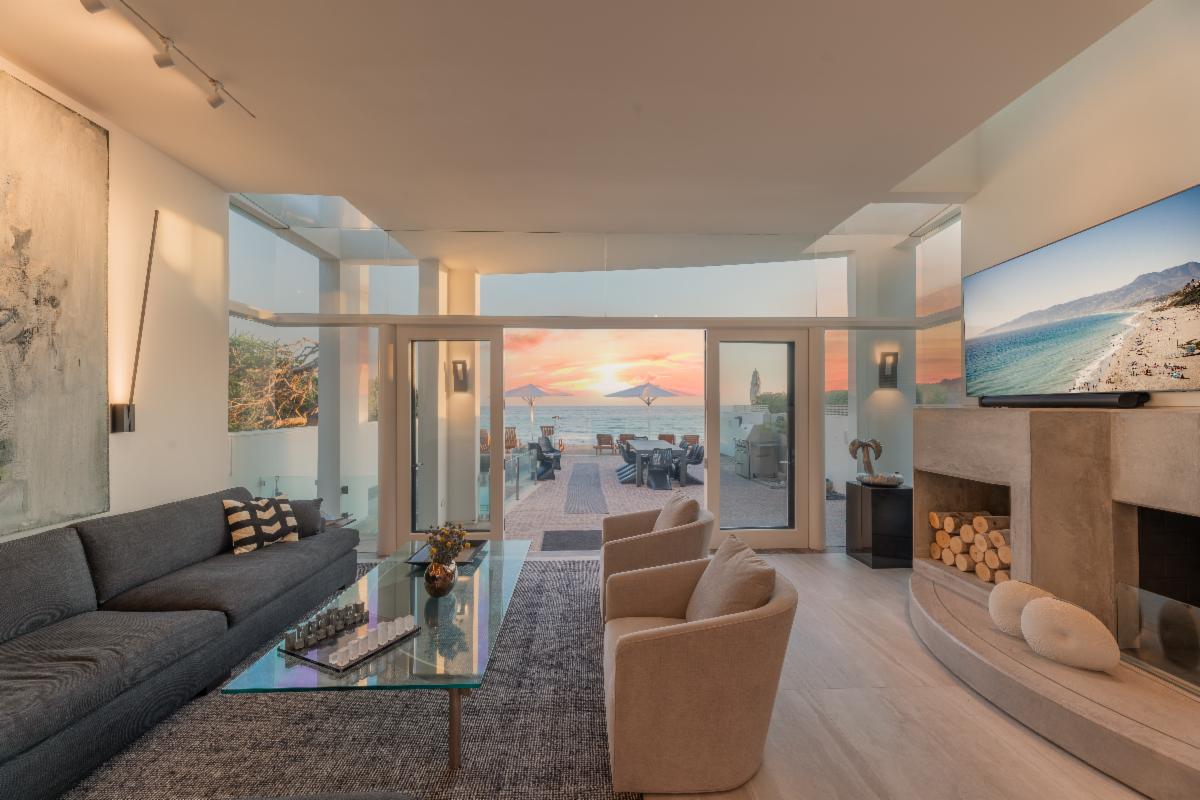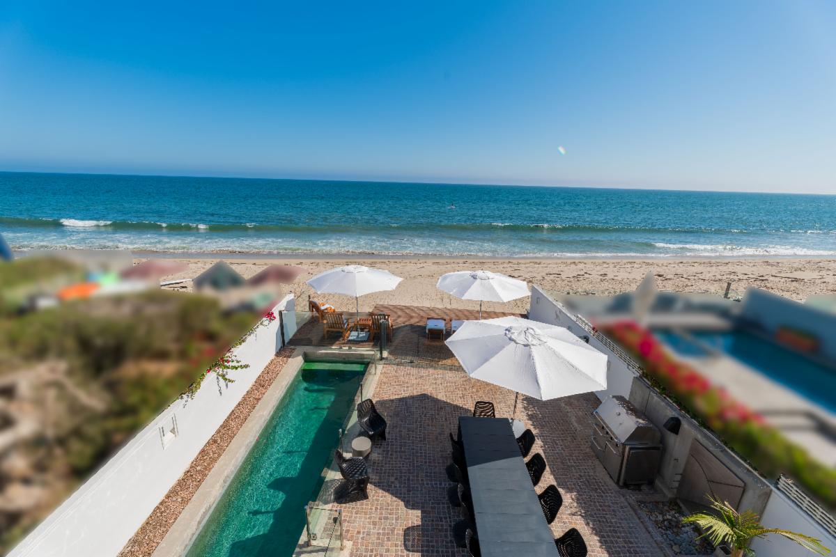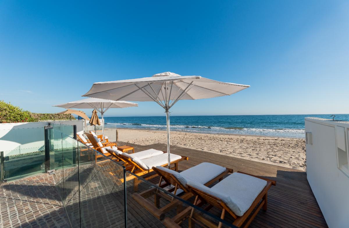 Located on the deepest part of sandy Malibu Colony beach, this stunning, newly remodeled architectural residence evokes the essence of Malibu beach sophistication. Gated for privacy, one enters into a fully landscaped courtyard where they are greeted by a modern water feature which leads to a large glass and beam enclosed entry. The impeccably furnished dining and living areas are as inviting as they are inspiring with soaring ceilings, recessed cove lighting, retractable buffets, significant art walls, contemporary fireplace and an ocean side wall of glass. Show off your culinary skills in style while watching the waves break in this newly completed entertainer's kitchen, which showcases gorgeous stone finishes, Miele appliances and touch-open cabinetry for that extra touch of class. The comfortable den includes a chic gallery wall of photography and display shelves for your collections. A private stairway takes you past the office alcove to the ocean view master suite and bath equipped with a glass privacy partition, skylights that allow you to star gaze from the bed, as well as a sitting area and oceanfront patio. There are three additional en-suite bedrooms and a detached studio perfect for live-in staff or visiting friends. There is an internal courtyard opposite the entry for casual conversation over a fire pit. The spacious beachfront patio with pool, spa, lounging and dining areas is the dream location for entertaining friends or a peaceful retreat for relaxing. Offered for sale at $34,500,000. Summer Monthly rental rate is $195,000. Winter monthly rental rate is $120,000. The height of luxury in the heart of Malibu's ‘Gold Coast’ awaits! |