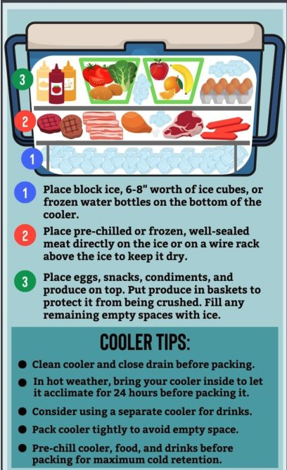 - Step 1: Choose a cooler and pack it effectively. Some qualities to consider when choosing a cooler would be its durability, affordability, insulating capacity, and its helpful features such as baskets, handles, or wheels. See the image on how to properly pack your cooler and where food and beverages can be placed.
