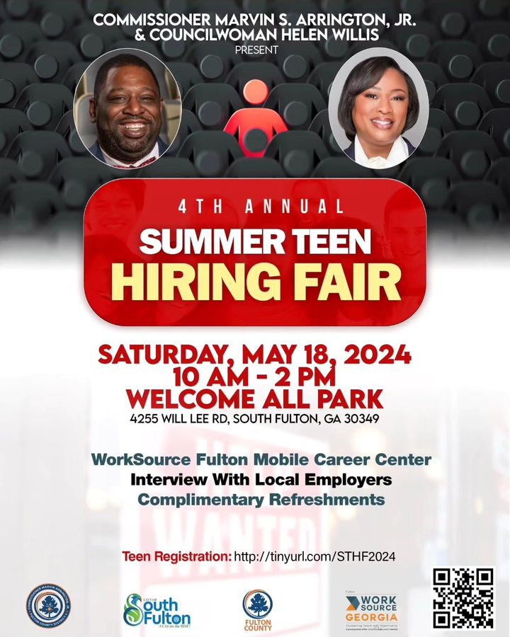 Councilwoman Helen Z. Willis and Fulton County Commissioner Marvin Arrington, Jr. invite you to participate in the 4th annual Summer Teen Hiring Fair! Our high school-aged teenagers are looking to obtain their first job or land an internship in a field of their interest. Last year, over 150 youth in attendance were seeking employment positions for the summer. This year, we hope to make it an even bigger and better event, but we can only do this with the help of our metro Atlanta business community.