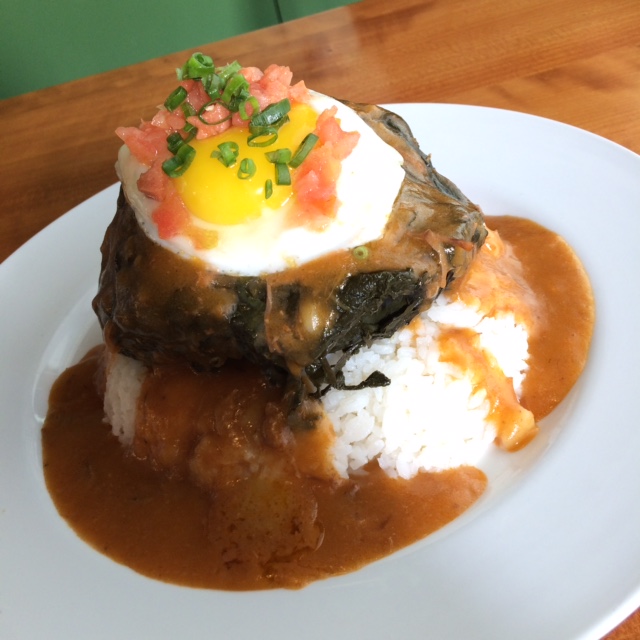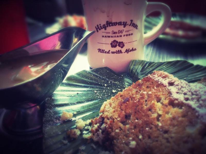 Bacon stuffed tempura bread pudding with haupia sauce