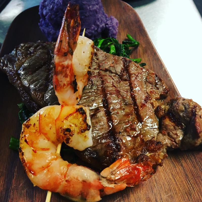 Flame broiled Jawaiian Rib-Eye with smoked Kalo puree & grilled Kuhuku Corn on the Cobb with demi glace drizzle.