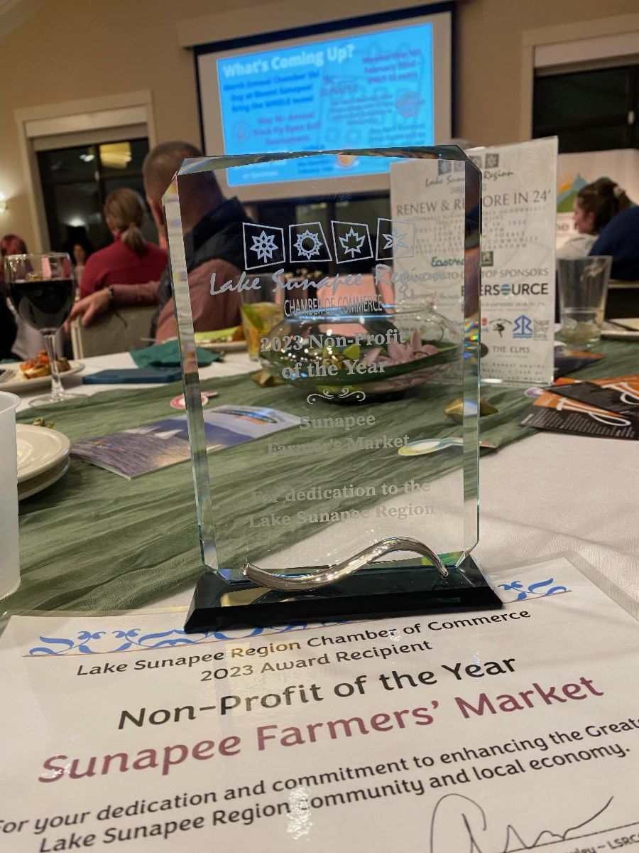 Congratulations to each of the people & the businesses recognized at the Lake Sunapee Region Chamber’s Annual Awards event! Project Sunapee was honored to be voted “Nonprofit of the Year” for their sponsorship of the Sunapee Farmer’s Market! A hearty “Thank You” to the leadership & organization of the Market Committee, all participating local farmers and growers, craftsmen, musicians, and special appreciation to the greater Sunapee community for gathering on the Ben Mere Green each summer Saturday morning, to shop, socialize & support the Market vendors.