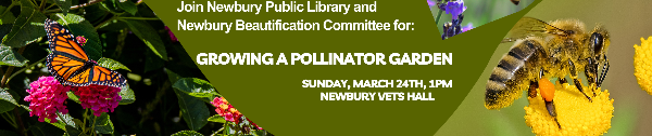 Join the Library and Newbury Beautification Committee on Sunday March 24th at 1pm for Growing a Pollinator Garden! Learn what it takes to grow a beautiful pollinator garden at your home! Insects such as bees and butterflies are helpful, and in some cases, essential, in pollinating many of our food crops such as apples, berries, and vegetables. In recent years, there has been a significant decline in the populations of these wild pollinators. Planting patches of flowers, wildflowers, grasses, shrubs, and flowering trees with an emphasis on the use of native plants can encourage and support natural pollinators as well as enhance backyard landscapes. Recommendations will be presented on creating a pollinator habitat from the UNH Master Gardeners!