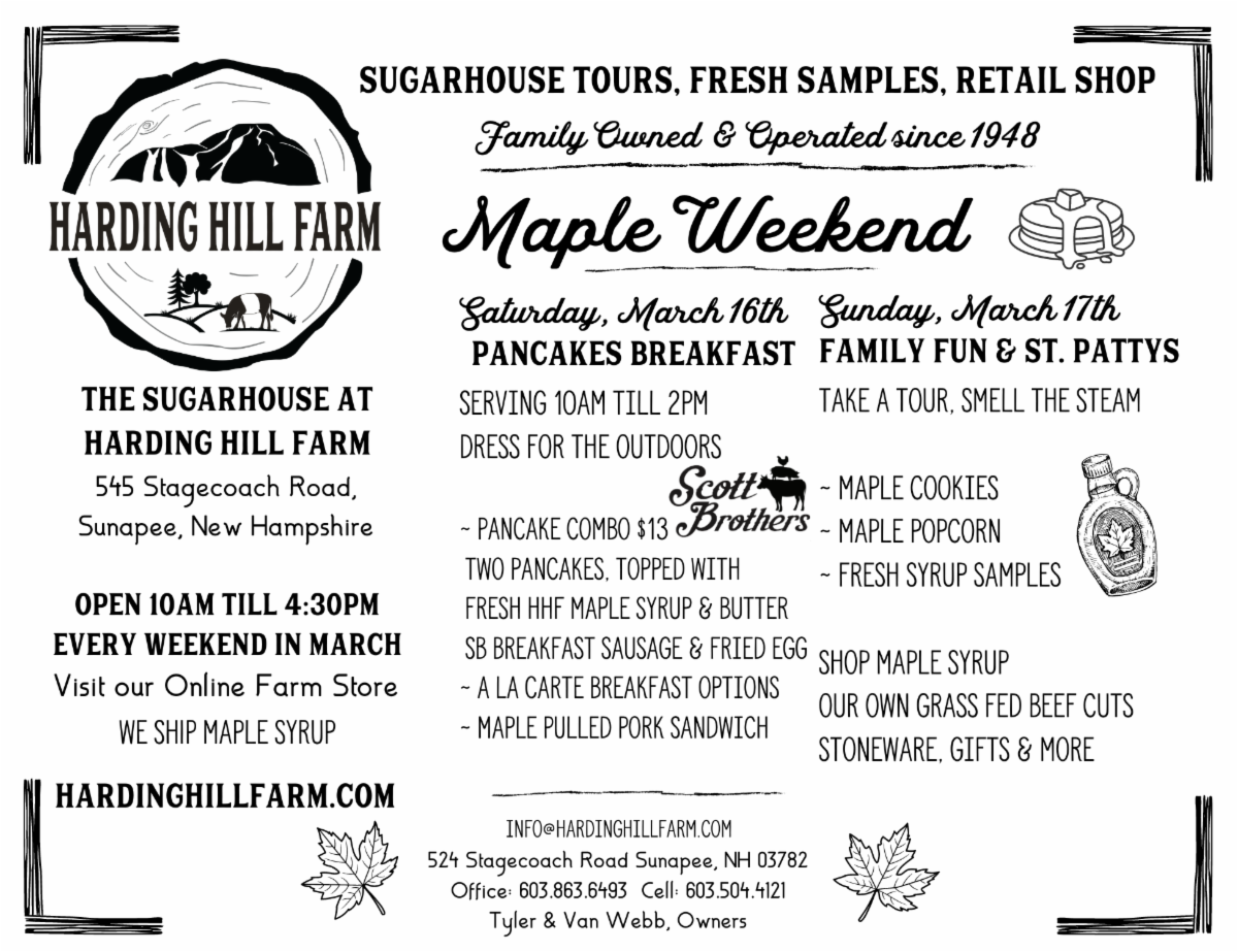 Once again smoke will be rising from local Sugar Houses for the 2nd NH Maple Weekend, March 22 & 23. In Sunapee, Harding Hill Farm and Sanctuary Dairy Farm are open and offering all things “Maple”! | |