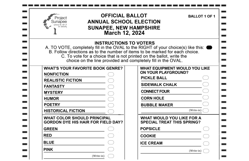 While mom & dad were voting on Candidates, Budgets and Planning & Zoning issues, Sunapee’s Elementary school kids cast their ballots as well for favorite activities & treats. Ballot results: | |