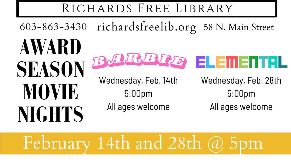 It's award season! Come see what all the fuss is about! Join us for a screening of Elemental on Feb 28th at 5 pm. This is a Free Event! You don't need to have a library card to join this event! See you at the Library.