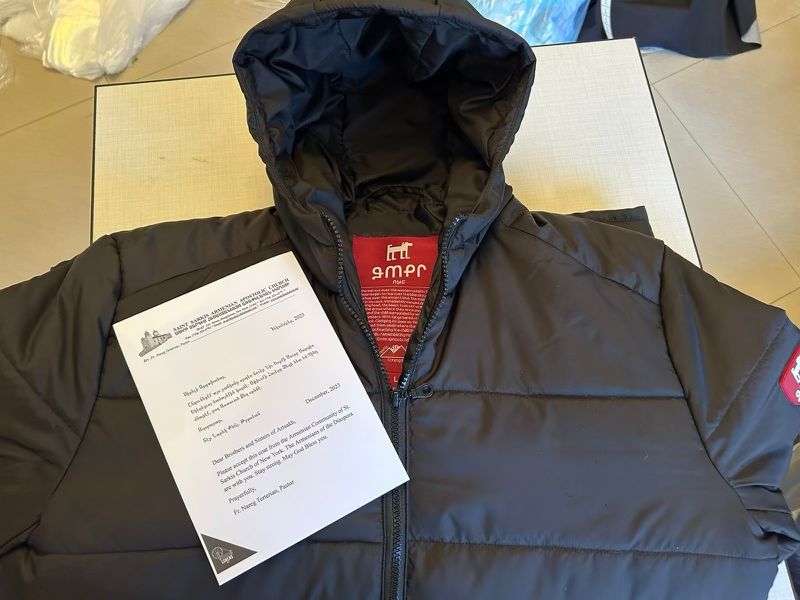 Please accept this coat from the Armenian Community of St. Sarkis Church of New York. The Armenians of the Diaspora are with you. Stay strong. May God Bless you.