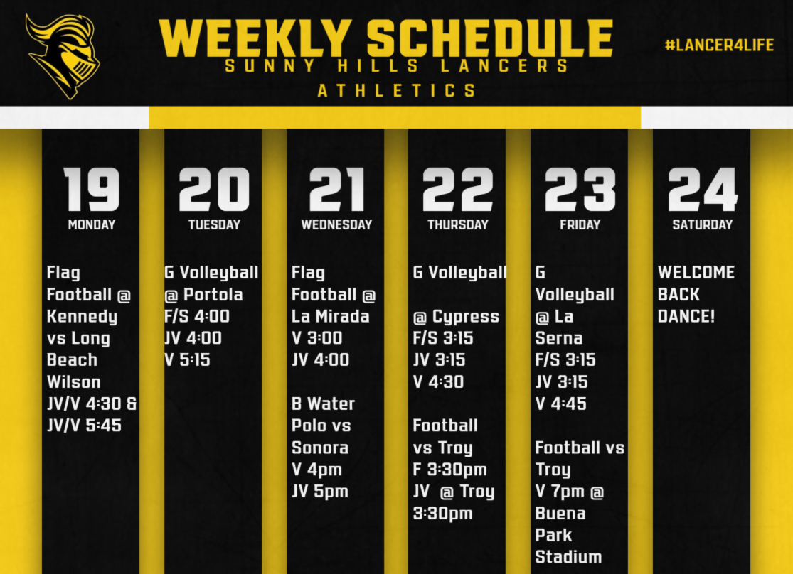 Lancer Athletics got underway with Girls' Volleyball securing a big win over Downey on Tuesday night with their special guest, Ronald Rochon, the new President of CSUF coming out to watch. Football begins with their scrimmage against Dana Hills tonight. We are primed for a great Fall season of sports ahead!
