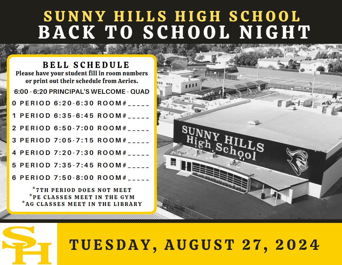 Back to School Night - Tuesday, August 27 will be Back to School Night beginning at 6:00 pm.