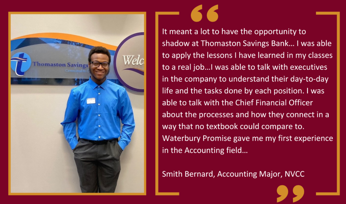 Waterbury Promise Scholars Smith Bernard, Jocelin Quituizaca and Jordan Rodriguez—all freshmen at Naugatuck Valley Community College—took advantage of an exclusive job shadowing day offered by Promise Partner Thomaston Savings Bank during their spring break week. The pilot program included banking basics, a behind-the-scenes look at banking operations, discussions about banking careers (and the many paths you can take to get there), quality time shadowing specific departments and networking opportunities with bank leadership (including President and CEO Stephen Lewis).
