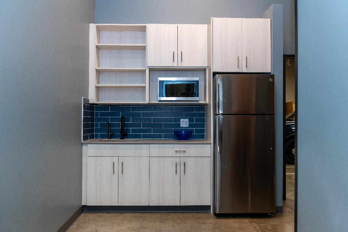 A new, modern kitchenette was added just outside the classroom, including a sink with a beautiful new kitchen faucet and stunning blue tile backsplash. Other kitchenette add-ons included a GE refrigerator/freezer and a countertop, which is framed by elegant shelving and cabinets both above and below. A microwave fits neatly on a shelf below the cupboards, to keep the counter space free.