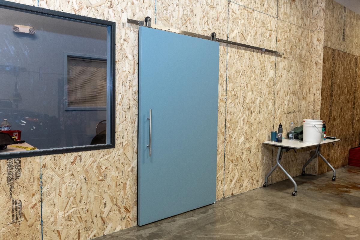 Walls were added inside the Training Annex entryway, to create separation between the classroom and the large garage section used for dynamic training scenarios. The two spaces connect via a rustic sliding barn-style door, while an added window provides visibility no matter where you are.